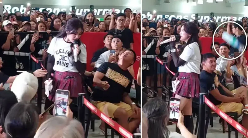 Makita sa video nga nahulog ang plastic bottle gikan sa taas nga bahin sa mall ug mitugpa sa likod sa singer-songwriter.