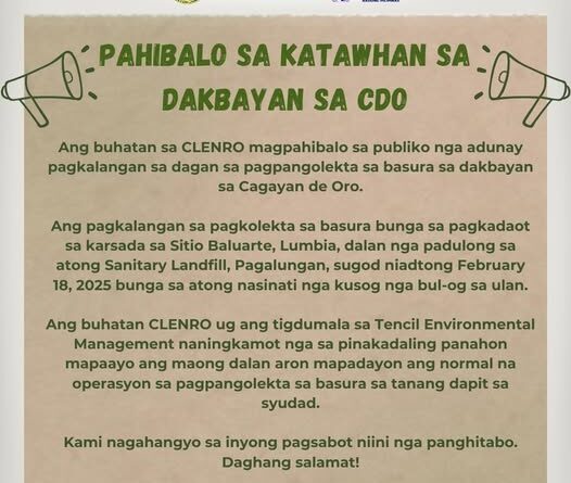 “..inyong na matikdan naay mga basura nga wala pa gihapon na kuha. kini tungod kay ang atong mga trucks nga gapanguha dili diritso maka balik kay delayed, kay nay on going construction sa dalan diha sa may Baluarte Lumbia and then walay lain access road going to sanitary landfill, mao na nga ma dilatar gyud labi na kay sig ulan. Karun didto man mi gi tanaw namo ma agi-an naman di pariha adtong kagahapon unya grabe gyud ka lapok ato ani is pa paspasan na nato ang pag hakot aron ugma adlawa mintras ma agi-an pa. pero kung mag ulan gani ug kusog ang dalan di gyud ma agi-an so mao na nga among hangyo sa mga katawhan nga unta sabton ug mag pa gawas ta sa atong basuraha kung naa nay truck…”