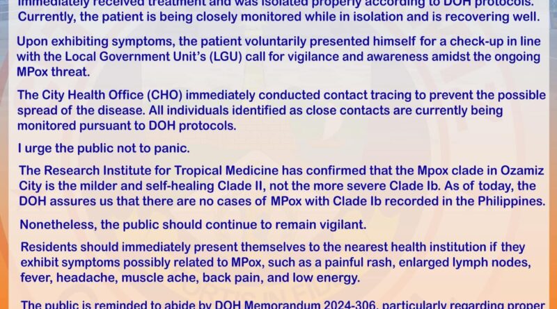 Unang kaso sa MPOX sa Ozamis City, gikumpirmar sa DOH-10!
