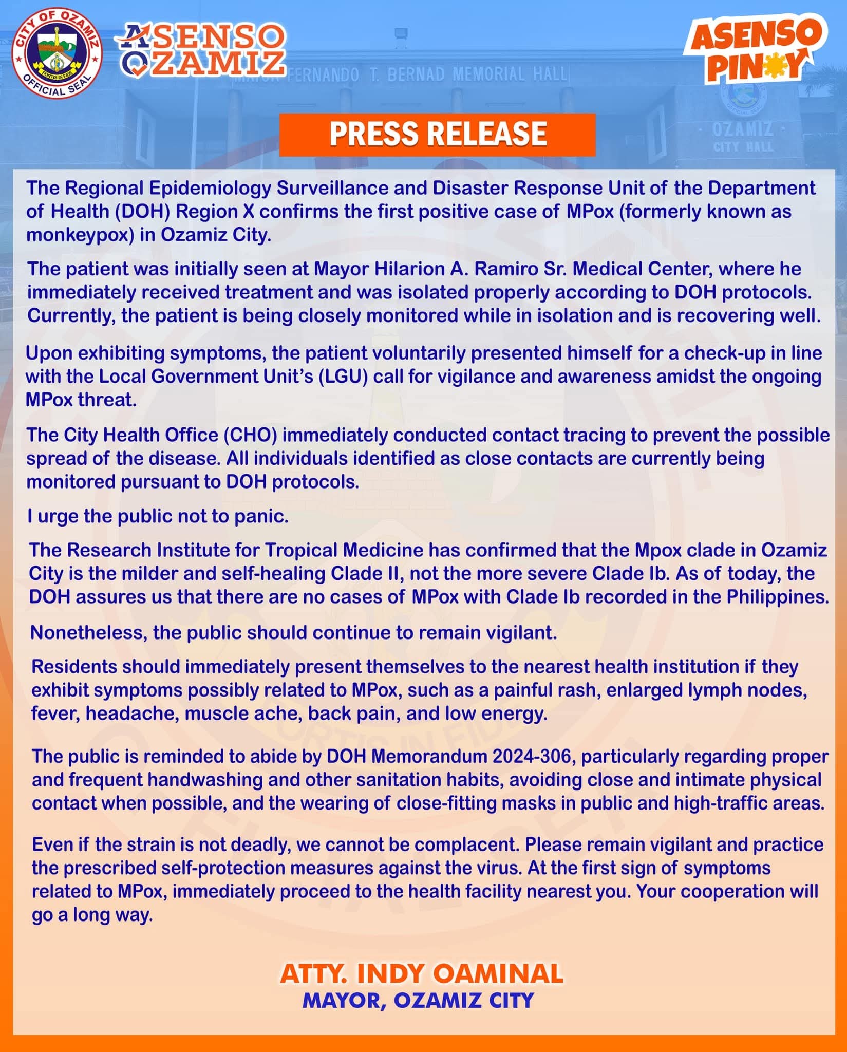 GIKUMPIRMAR sa Department of Health kon DOH-10 Regional Epidemiology Surveillance and Disaster Response Unit ang unang kaso sa monkeypox kon MPOX sa Ozamiz City!