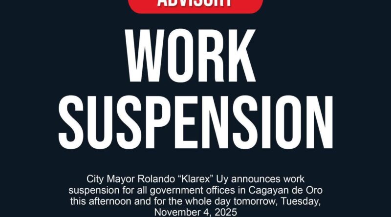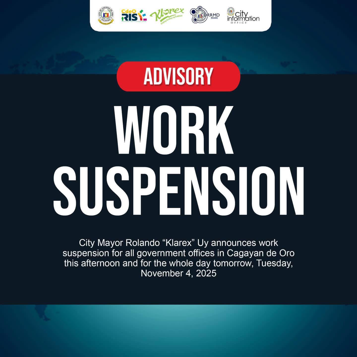 “..Naka base na si Mayor sa nigawas nga Presidential Order No. 66 nga naay work suspension gipagawa ni President Marcos, in connection aning bagyong Tino, gi-adopt na ni Mayor Klarex ug sa atoang local government unit sa Cagayan de oro, then nag announce sya karon lang nga mag suspend sya sa trabaho to all government offices within Cagayan de oro city kining executive order, effective na kibali karong hapon until ugmang adlawa whole day, as per private offices, discussion jud japon na sa ilahang head of office if ever man gali nga ma push through nila ang empleyado noh sa pagtrabaho despite sa ingon ani ang lakaw sa panahon, so wala may control ang gobyerno anang private offices but mag incourage lang nato nga ilang i-adopt ang executive order nga gipagawas ni Mayor para na pud sa safety sa ilang empleyado..”
