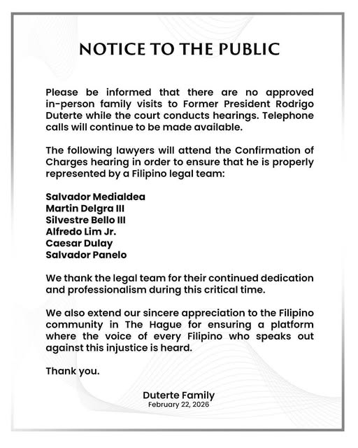 Pagbisita sa pamilya ni FPRRD, gidid-an nga makabisita nunot sa pagsugod sa confirmation of charges karong adlawa!