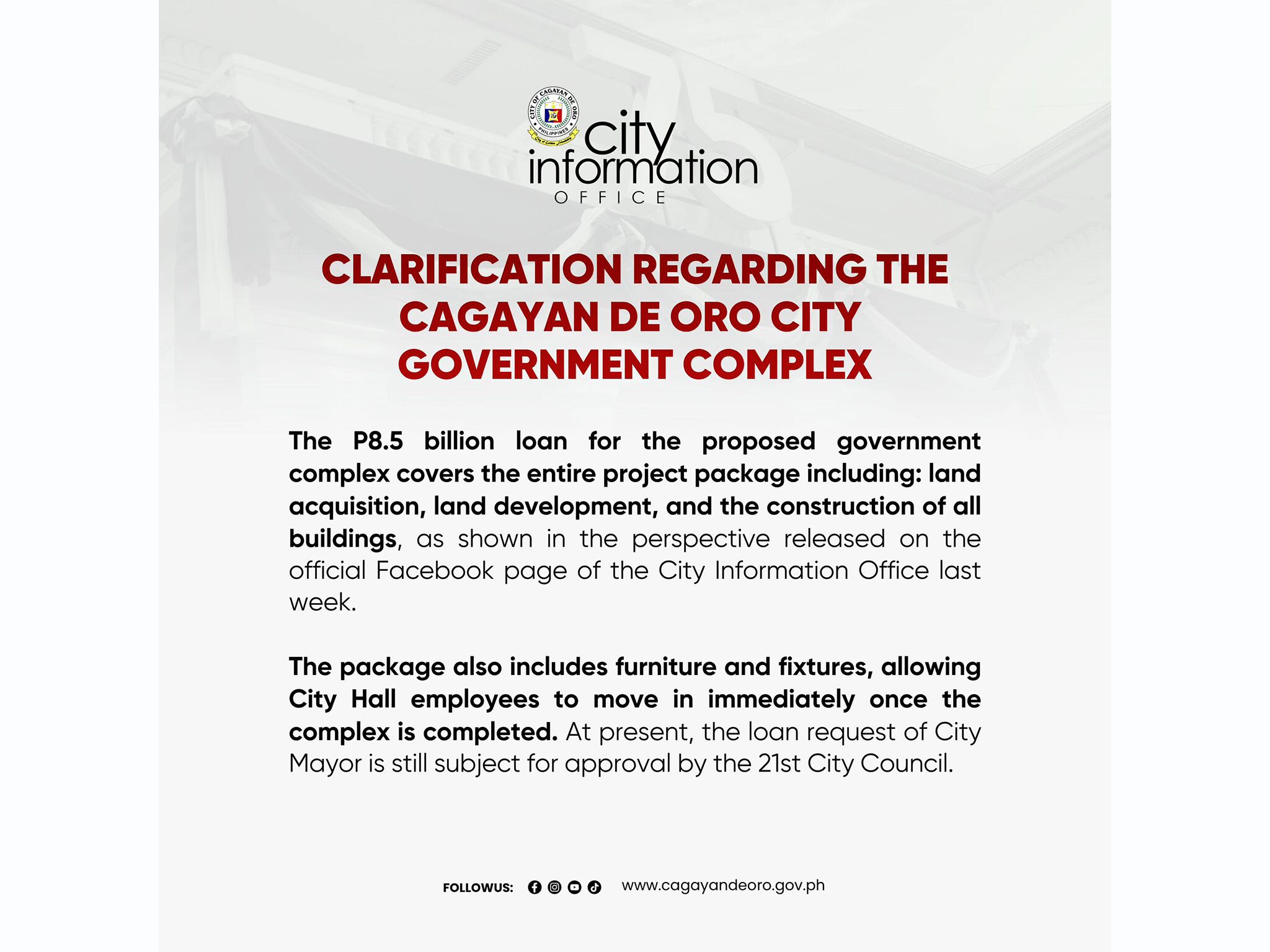 Maglakip usab kini sa furniture ug fixtures, magtugot sa City Hall employees nga gilayong makabalhin kung hingpit nga matapos ang complex.